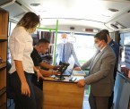 Acıpayam Belediyesi Hasan Tahsin Akıncı Gezici Kütüphanesi’nin bir özelliği de elektrik ihtiyacını otobüs üzerinde bulunan güneş panellerinden karşılaması.
