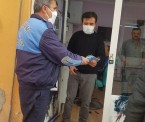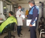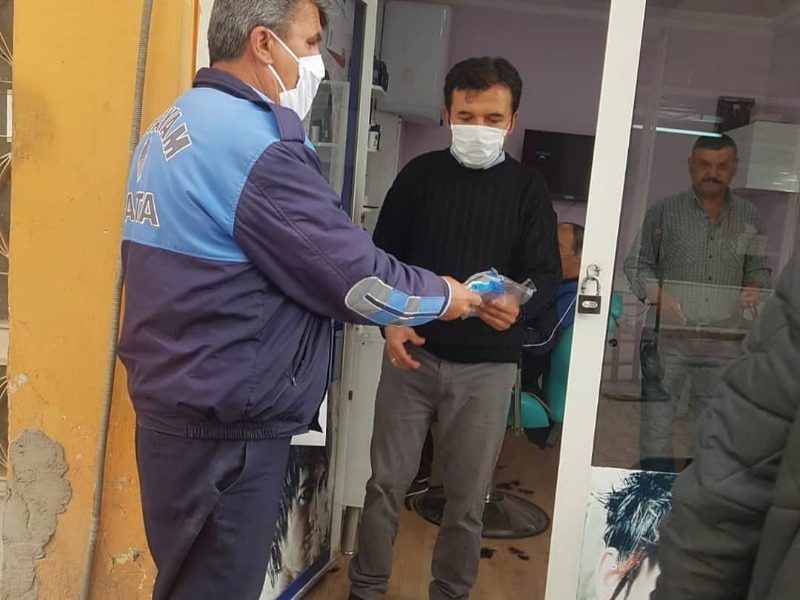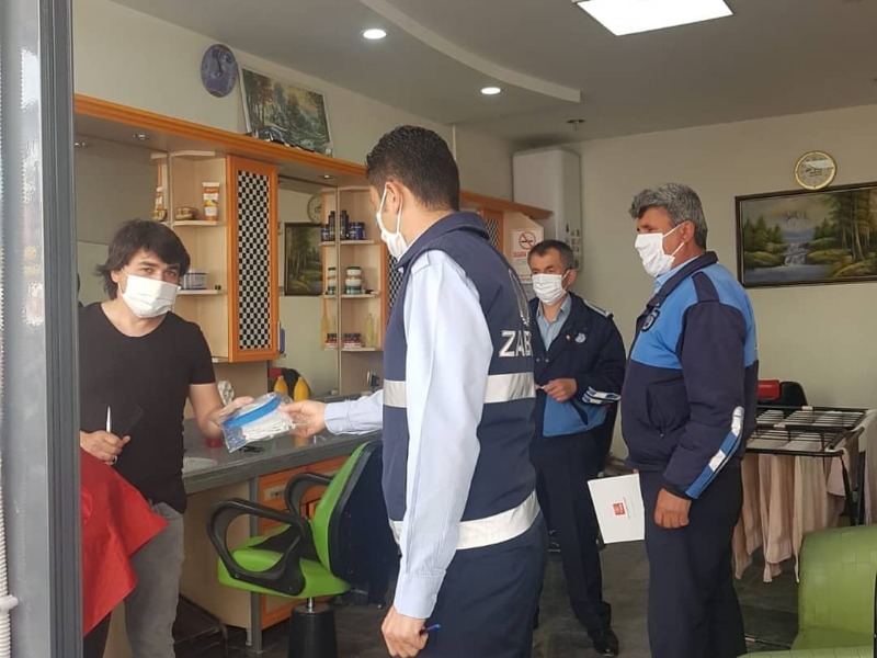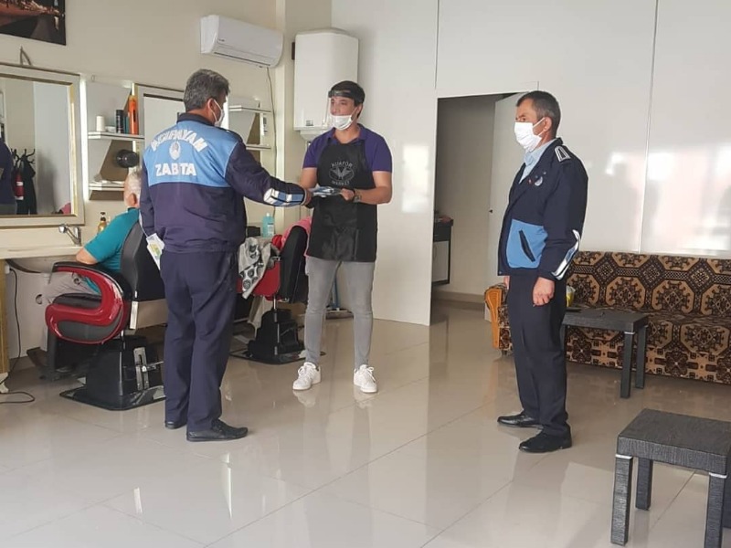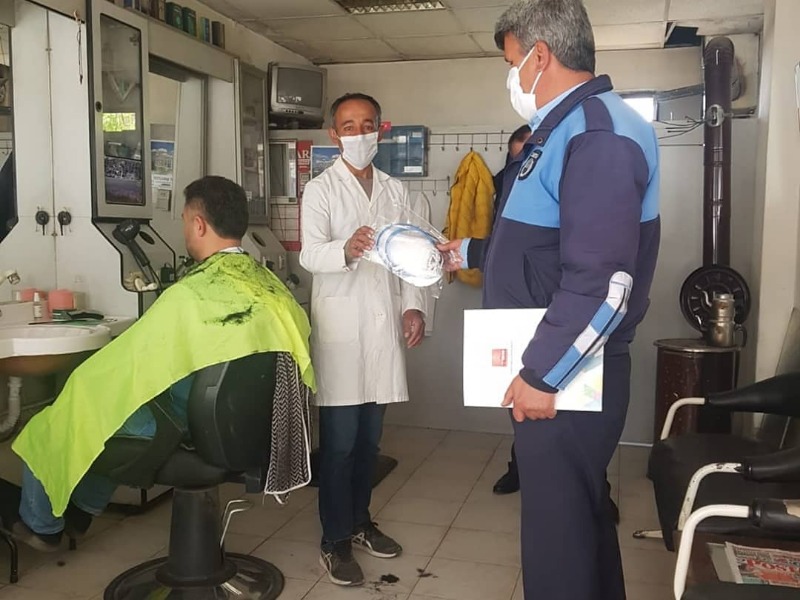 Belediye Zabıta personelleri berber ve kuaförlere maske ve yüz siperliği dağıtımı yaptılar.