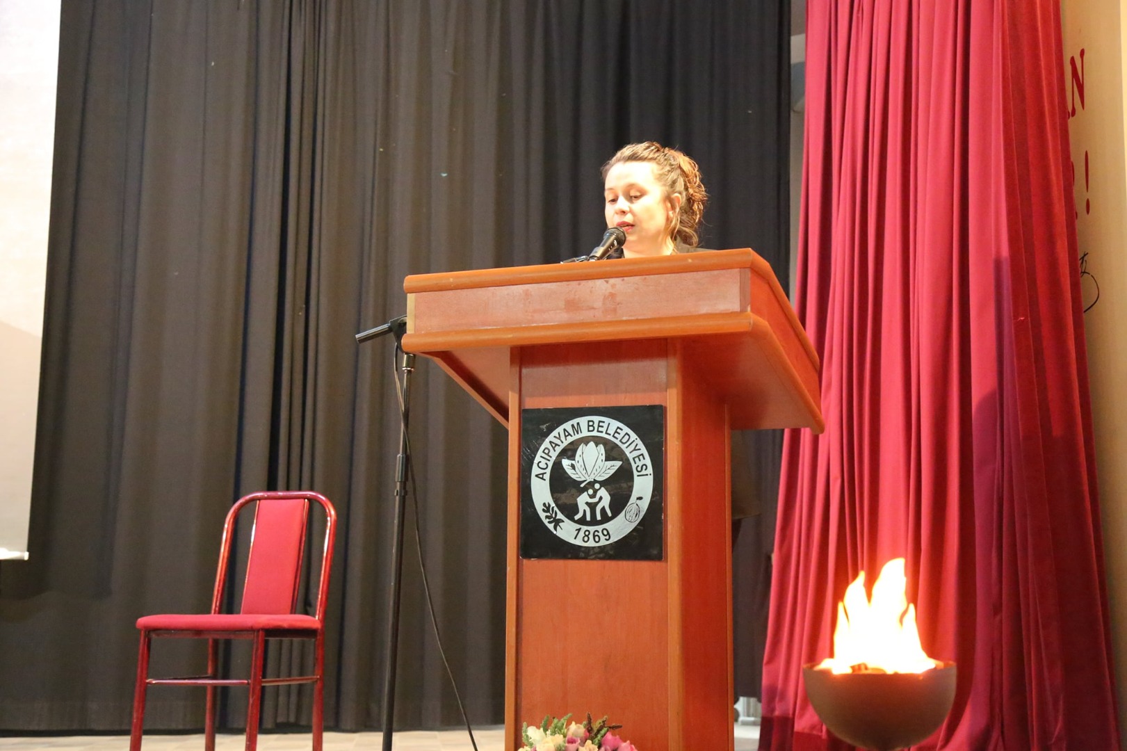 Acıpayam Cumhuriyet Anadolu Lisesi öğretmen ve öğrencilerinin hazırladığı programda, saygı duruşu ve İstiklal Marşının ardından, günün anlam ve önemini belirten konuşmalar yapıldı.Öğrencilerin duygu dolu anları içeren tiyatro gösterimi, şiirleri ve türkülerin ardından ilçe genelindeki okullarda düzenlenen çeşitli yarışmalarda dereceye giren öğrencilere ödülleri ilçe protokolü tarafından verilmesiyle program sona erdi.