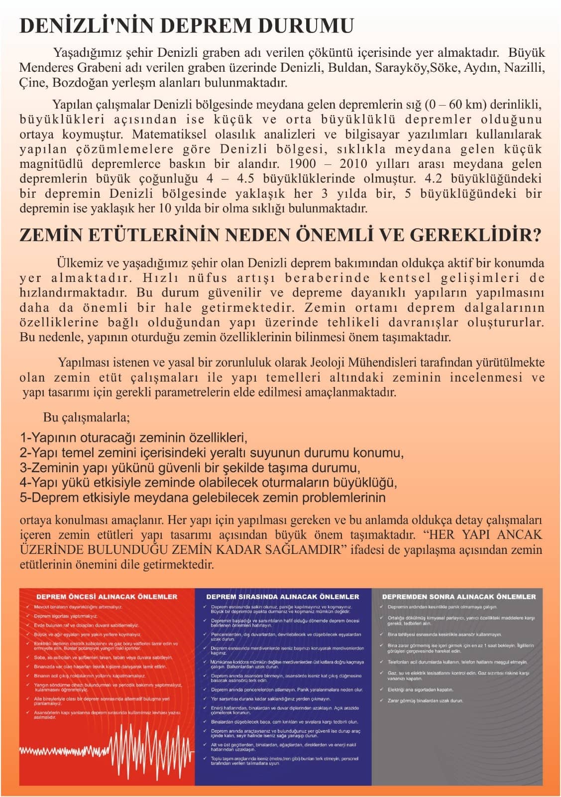 Denizli’nin Türkiye’nin en aktif 3 fay hattının birinin üstünde bulunduğunu ifade eden Jeolog Doç. Dr. Mete Hançer “Bu gerçekle yaşamamız gerekiyor. Bölgemizde sürekli olarak depremler meydana geliyor. Son 100 yılda bölgemizde 7’nin üstünde bir deprem meydana gelmedi. O yüzden 7’nin üstünde bir deprem beklemiyoruz. Depremin zamanını bilemeyiz. Bilen de zaten şaklabanlık yapıyordur. Depremin yerini ve saatini açıklayan kişilere asla inanmayın. Bunun yanında dünyamızın çekirdeği sürekli hareket halinde. Bunun en büyük kanıtı önce volkanlar sonra da depremlerdir. Deprem hayatın bir gerçeği. Bu gerçekle yaşamalıyız. Binalarımızı buna göre yapmalıyız. Bunun tek yolu da hem zemini hem de binaları sağlam yapmaktan geçer. Aksi halde ister zemini isterseniz de binayı sağlam yapın binanız büyük bir oranda yıkılacaktır” dedi.