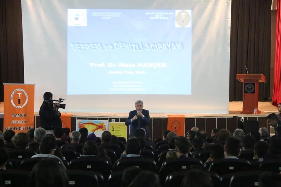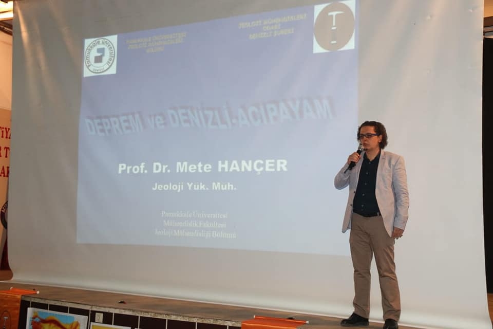 PAÜ. Jeoloji Mühendisliği Bölümü Prof. Dr. Mete Hançer ve Jeoloji Mühendisleri Odası Başkanı Doç. Dr. Barış Semiz,Jeoloji mühendisleri odası Denizli Şubesi yönetim kurulu üyeleri Bahtiyar KOLÇİR, Burcu ŞiRİN, Murat Akyol'un katılımlarıyla ‘’Deprem ve Acıpayam’’ başlığı altında 20 Mart 2019 da Acıpayam’da meydana gelen 5.8 şiddetindeki depremle ilgili verilen eğitimde PAÜ. Mühendislik Fakültesi Jeoloji Mühendisliği Bölümü Öğretim Üyesi Doç. Dr. Mete Hançer ilçe protokolü, öğrenciler ve vatandaşlara deprem hakkında bilgi verdi.