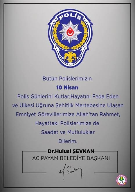 Polis Teşkilatımızın 175.Kuruluş yıldönümünde bütün Polis kardeşlerimizin 10 Nisan Polis Günlerini kutlar; vatanımızın ve milletimizin birliği ve esenliği uğruna canını feda edip şehitlik mertebesine ulaşan emniyet görevlilerimize Allah'tan rahmet, kederli ailelerimize sabır, hayattaki polislerimize de sağlık ve saadetler dilerim. Dr.Hulusi ŞEVKAN Acıpayam Belediye Başkanı