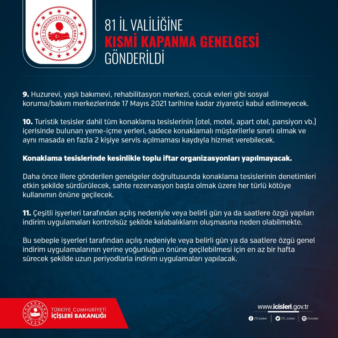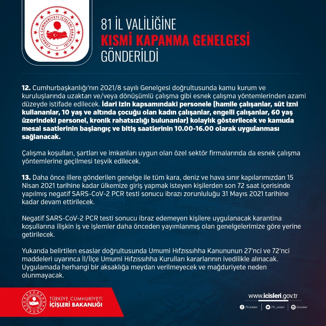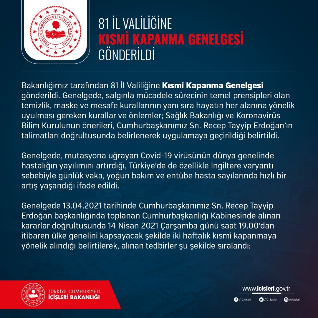 9- "(Kısmi kapanma 2 haftalık) Uygulama, yarın(14 nisan 2021)akşam saati itibarıyla başlayacaktır."
