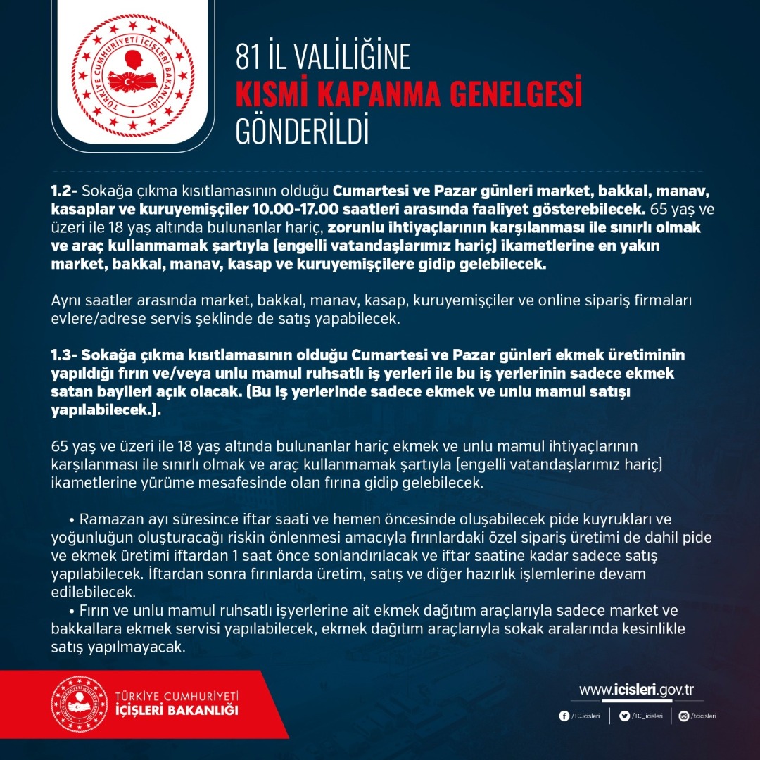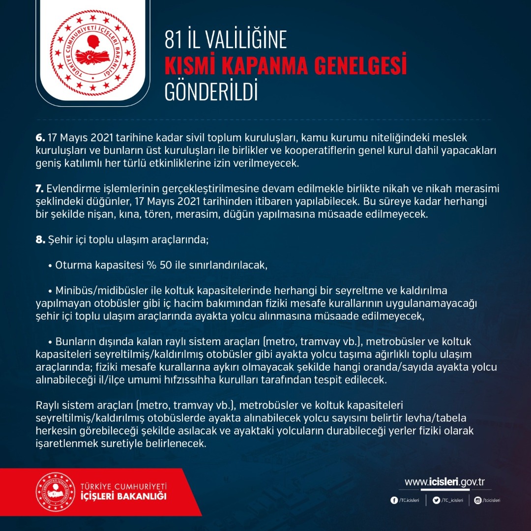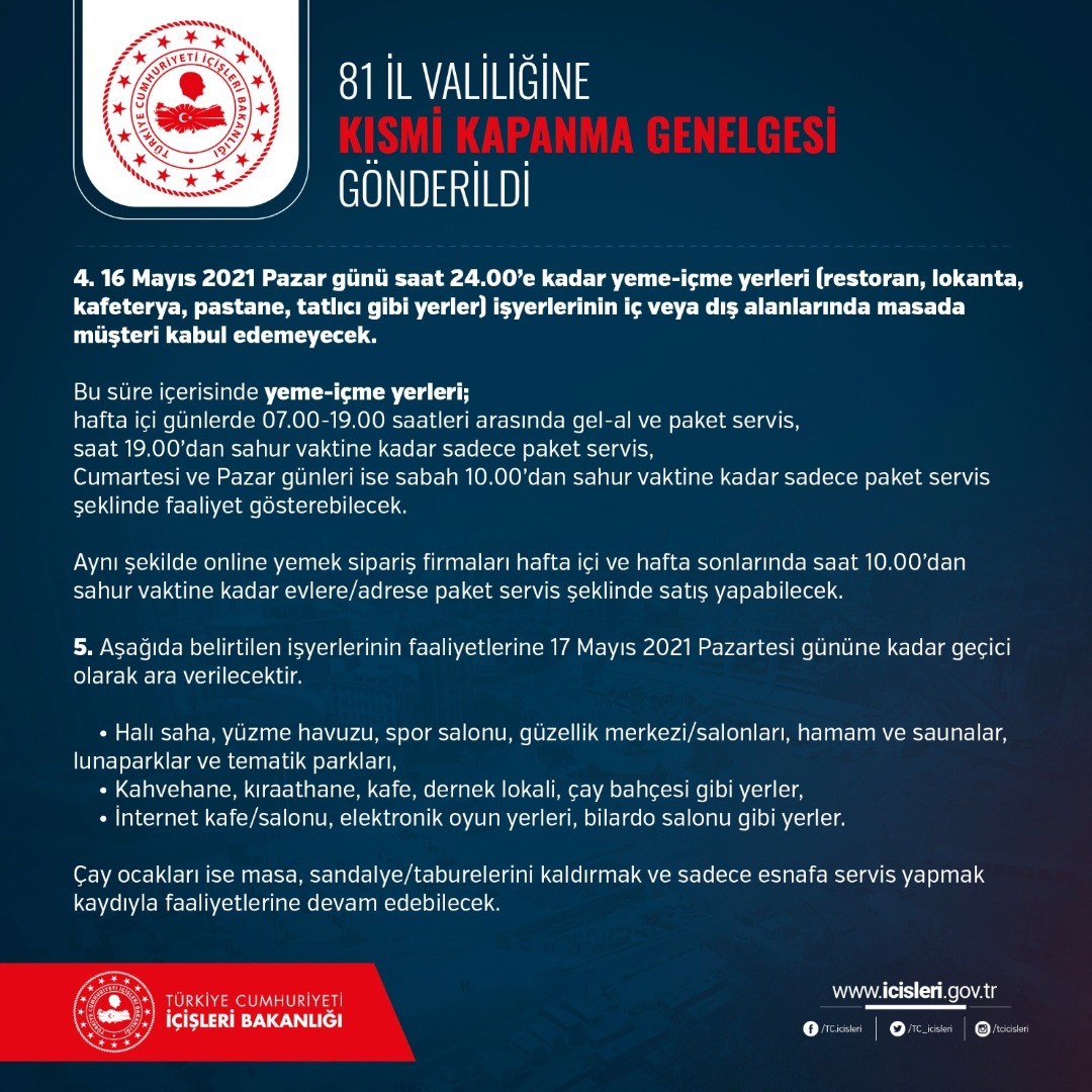 9- "(Kısmi kapanma 2 haftalık) Uygulama, yarın(14 nisan 2021)akşam saati itibarıyla başlayacaktır."