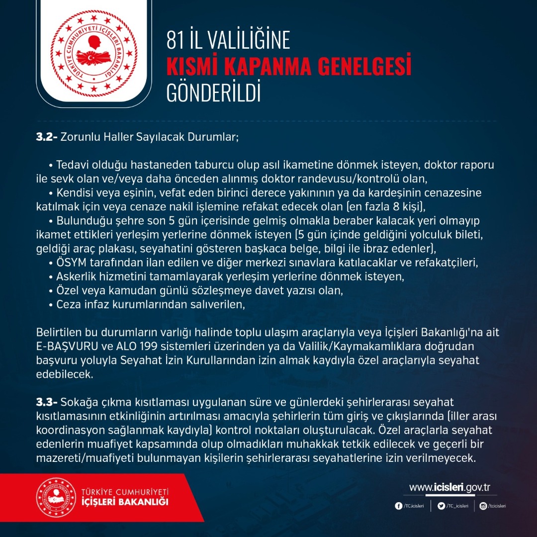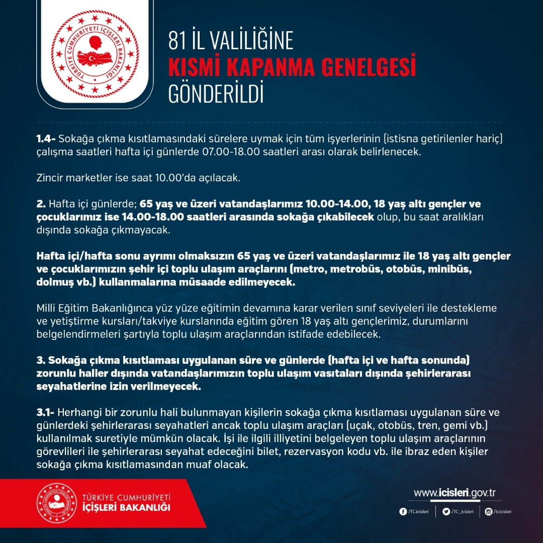 2- "65 yaş üstü ve 18 yaş altının şehir içi toplu taşıma araçlarını kullanma sınırlamasını yeniden getiriyoruz. Hafta içi günlerde; #65yaş ve üzeri vatandaşlarımız 10.00-14.00, #18yaş altı gençler ve çocuklarımız ise 14.00-18.00 saatleri arasında sokağa çıkabilecek olup, bu saat aralıkları dışında sokağa çıkmayacak.