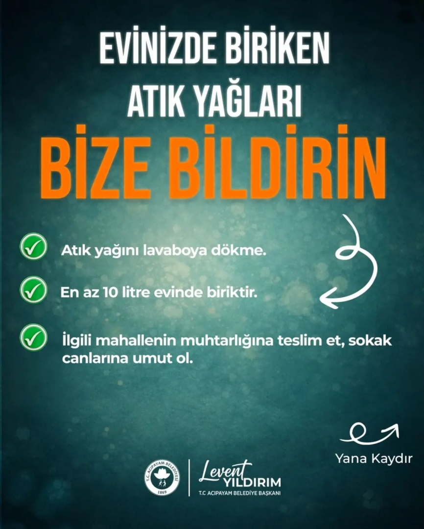 Belediyemizce çevreyi korumak ve sokak hayvanlarına destek olmak amacıyla anlamlı bir geri dönüşüm çalışmasını hayata geçiriyoruz. Evlerde biriken bitkisel atık yağlar, doğaya zarar vermeden değerlendirilecek ve elde edilen gelirle patili dostlarımızın mama ihtiyacına katkı sağlayacağız.