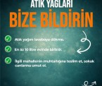 Vatandaşlarımızdan, kullanılmış bitkisel yağları lavaboya dökmek yerine evlerinde biriktirmeleri istiyoruz. En az 10 litreye ulaşan atık yağlar, mahalle muhtarlıklarına teslim edilerek bu çevreci ve duyarlı projeye destek olunabilecek.